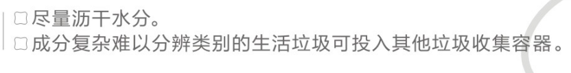 厨余垃圾水分多,易腐烂变质,散发臭气,既影响环境,也容易在垃圾收运过程中出现污水滴漏等问题,所以厨余垃圾投放时要沥干水分。